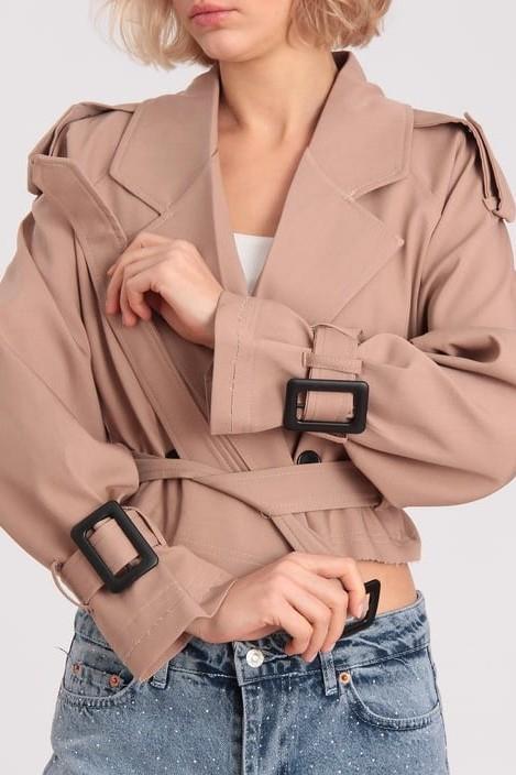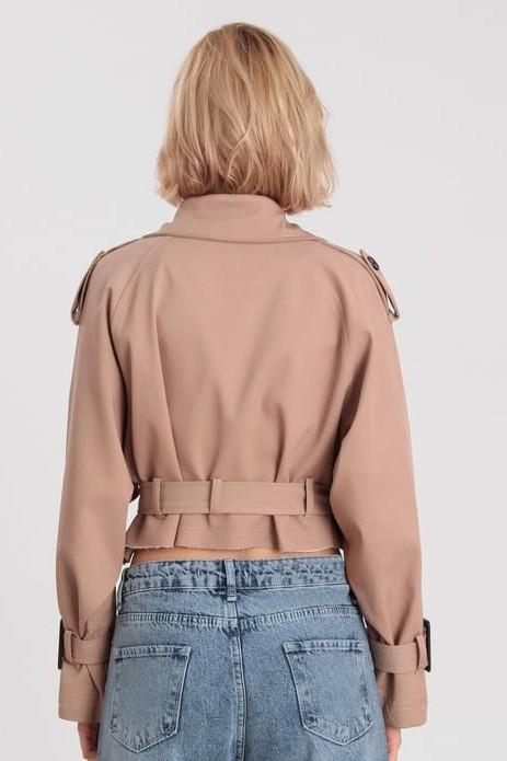 İç Astarı Çizgili Kemerli Oversize Kısa Ceket PR9306