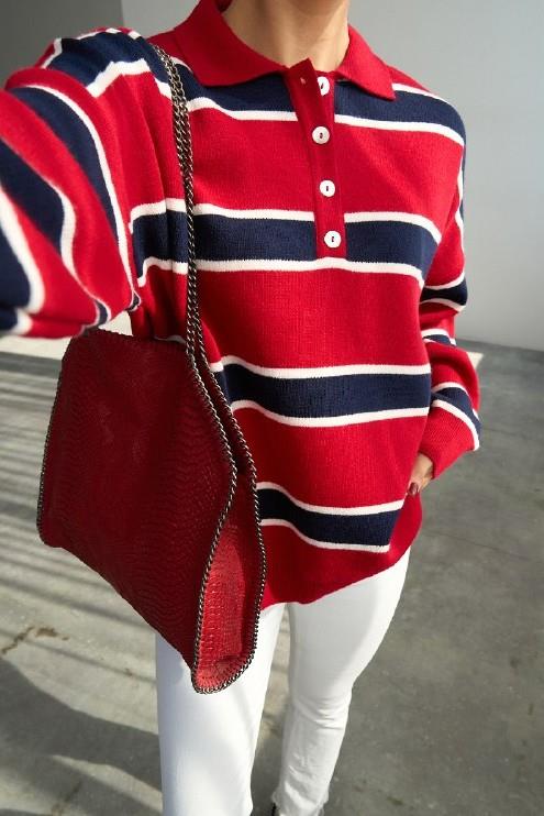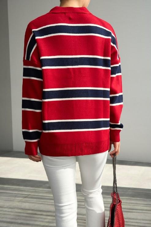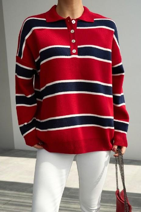 Polo Yaka Düğme Detaylı Şeritli Kazak QS251129