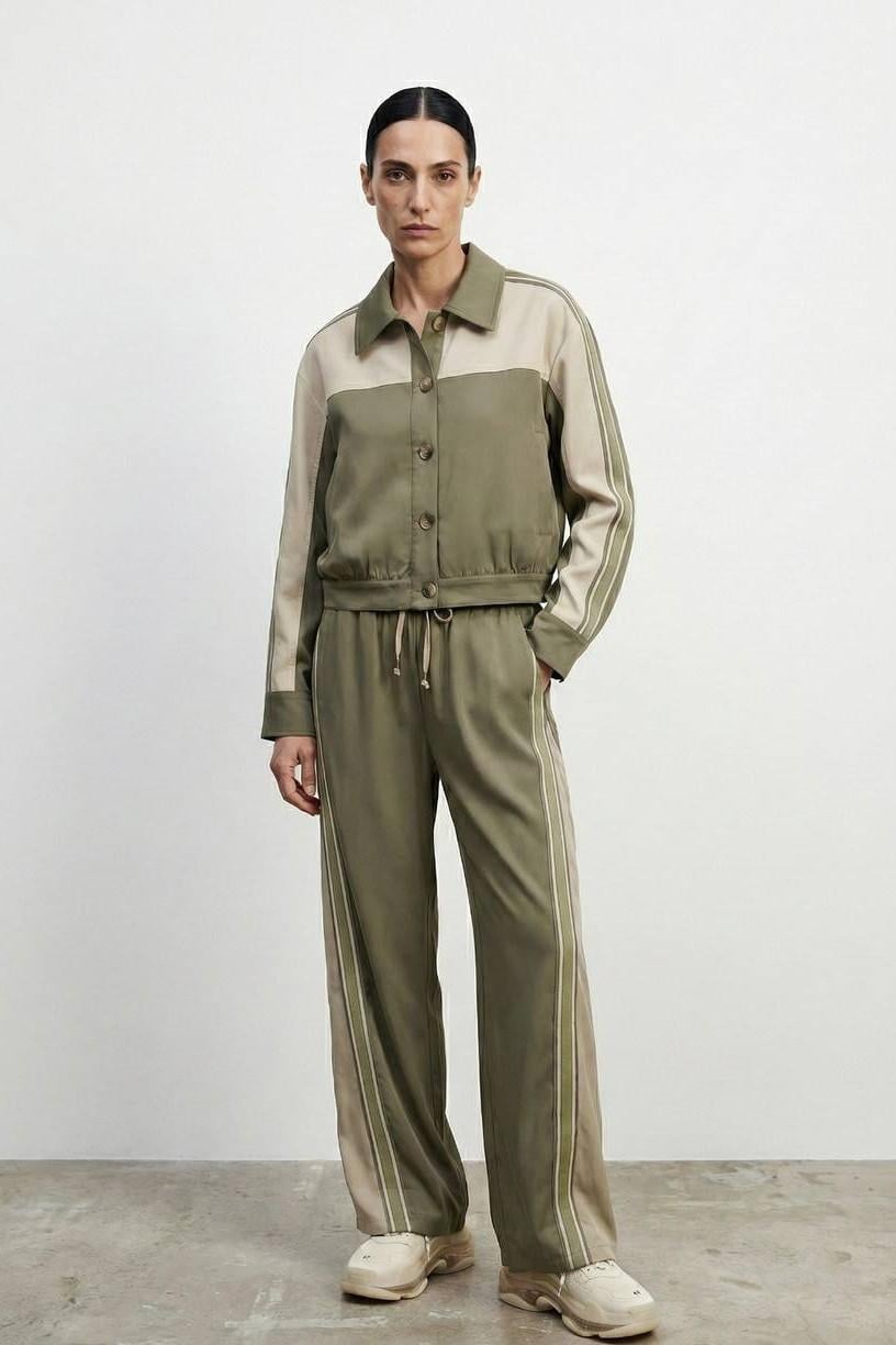 Şerit Detaylı Çift Renk Saten Ceket Pantolon Takım QZ01592