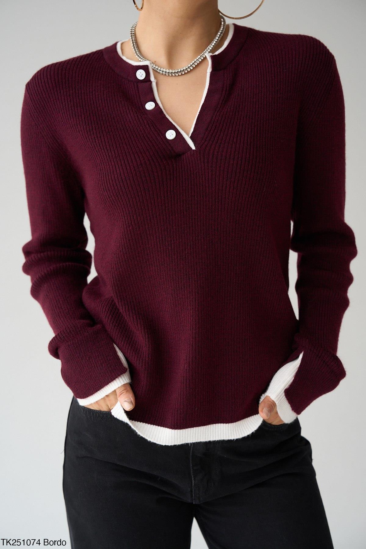 V Yaka Düğme Detaylı Çift Renk Kazak QS251074