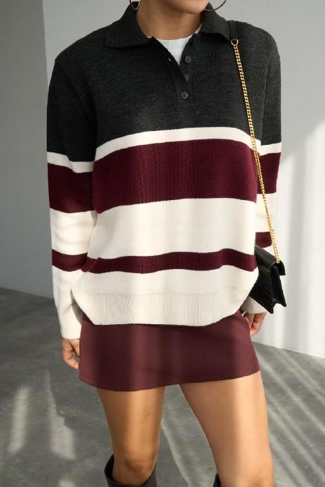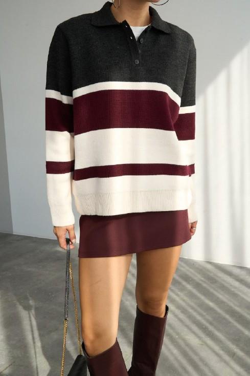 Yakası Düğmeli Polo Yaka Çizgili Kazak QS251125
